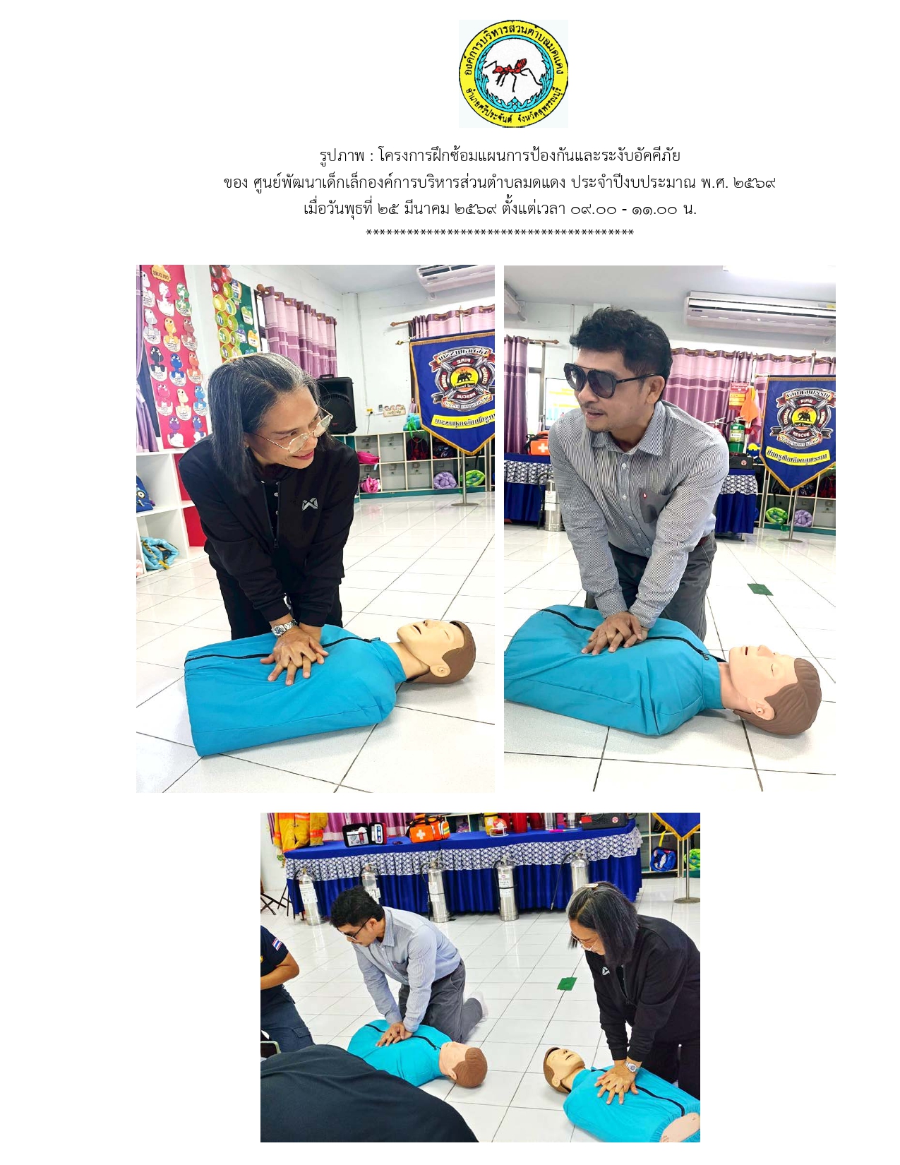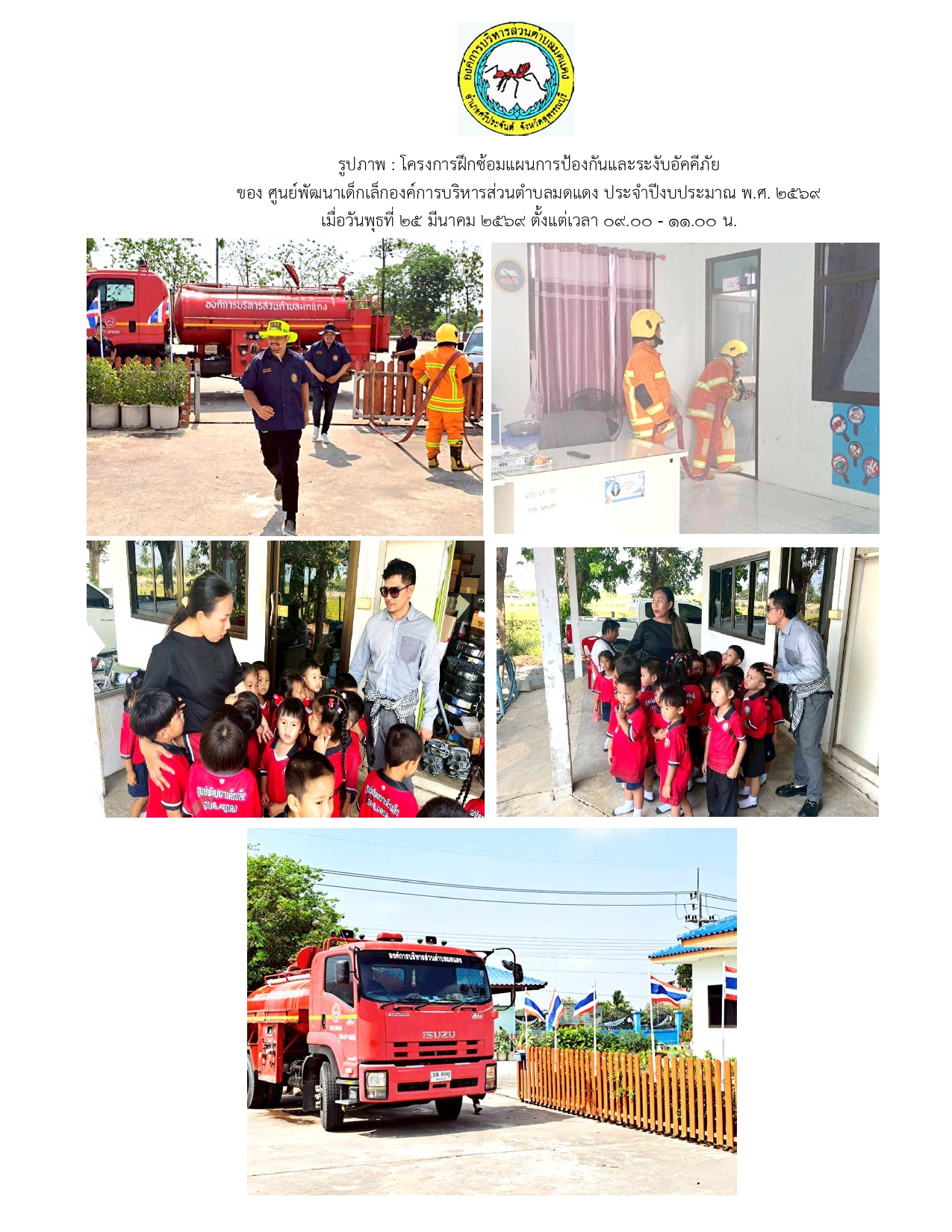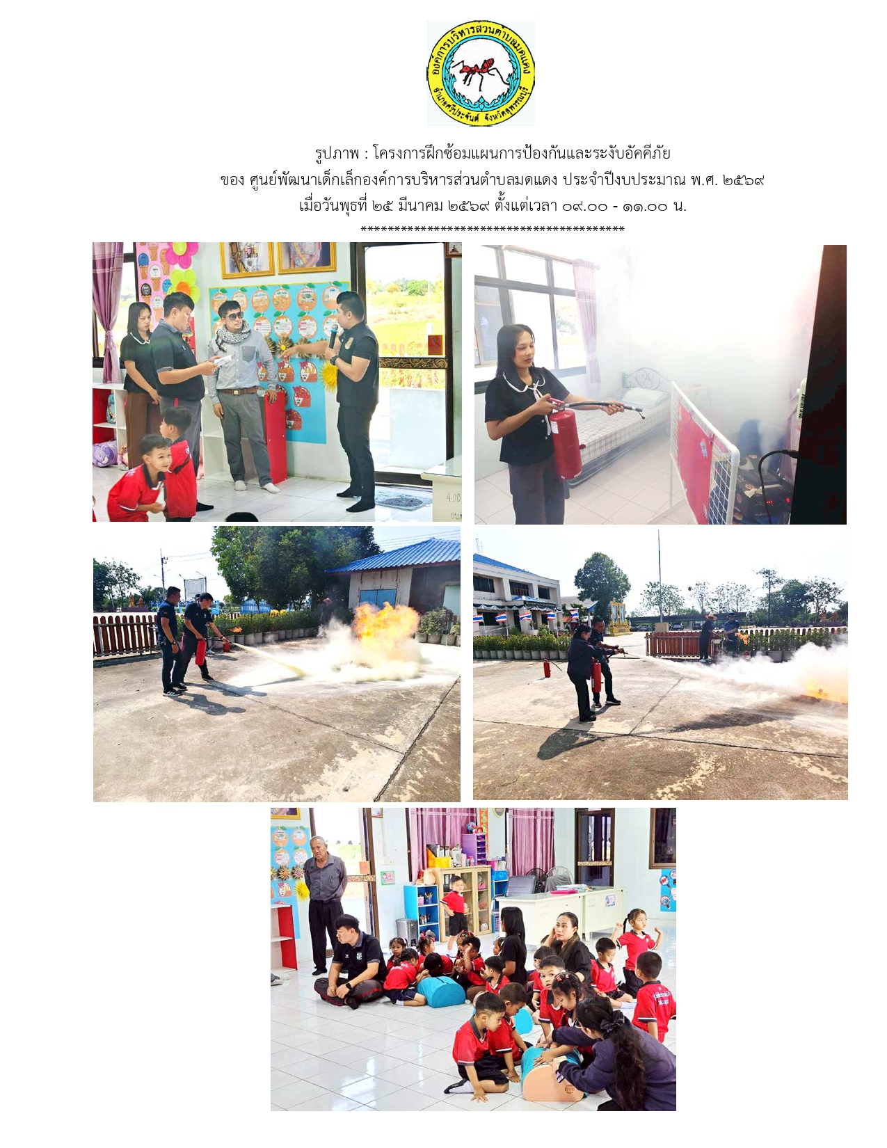 โครงการฝึกซ้อมแผนการป้องกันและระงับอัคคีภัย ของศูนย์พัฒนาเด็กเล็กองค์การบริหารส่วนตำบลมดแดง ประจำปีงบประมาณ พ.ศ. 2569 เมื่อวันพุธที่ 25 มีนาคม 2569 ตั้งแต่เวลา 09.00 - 11.00